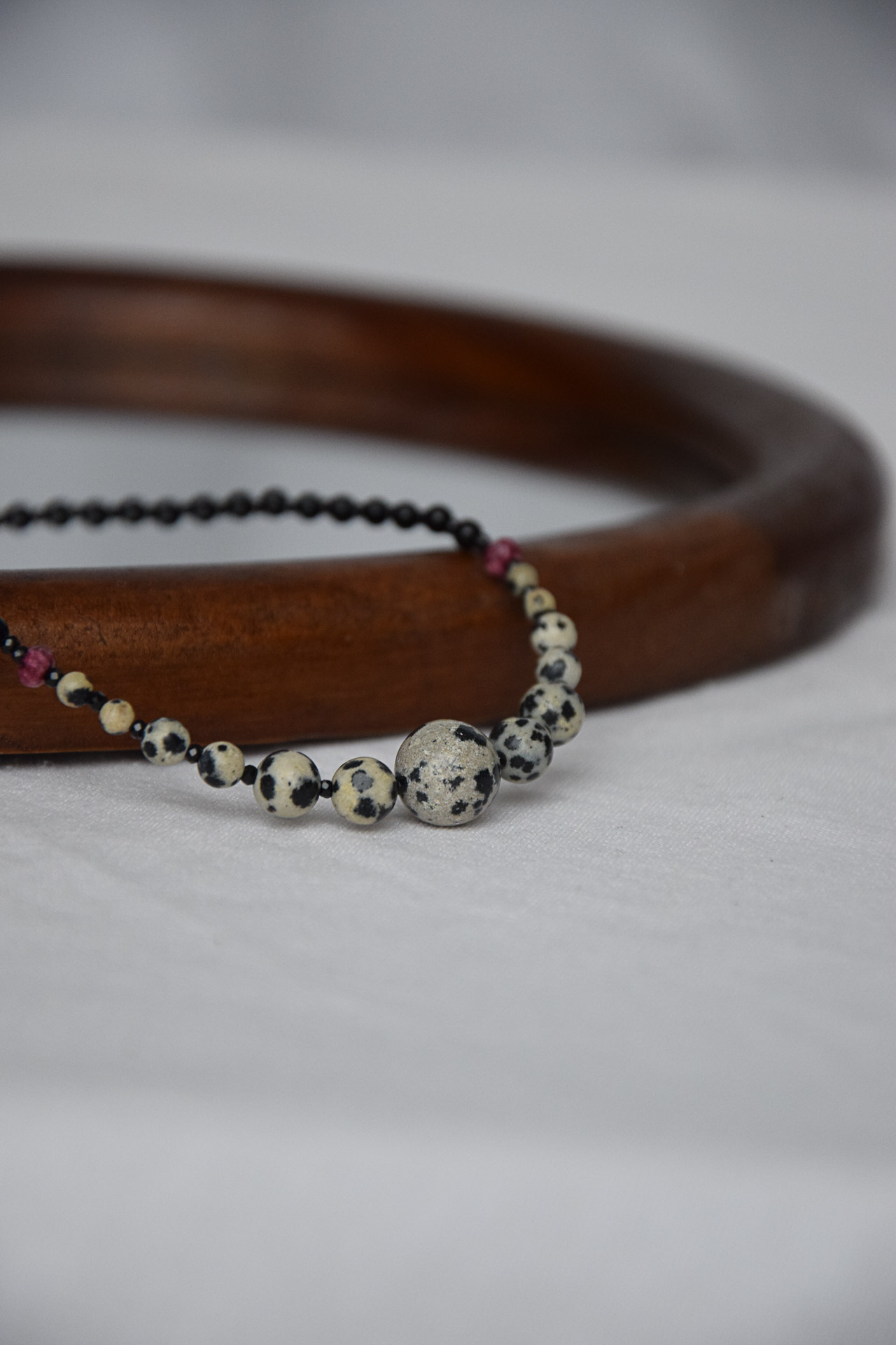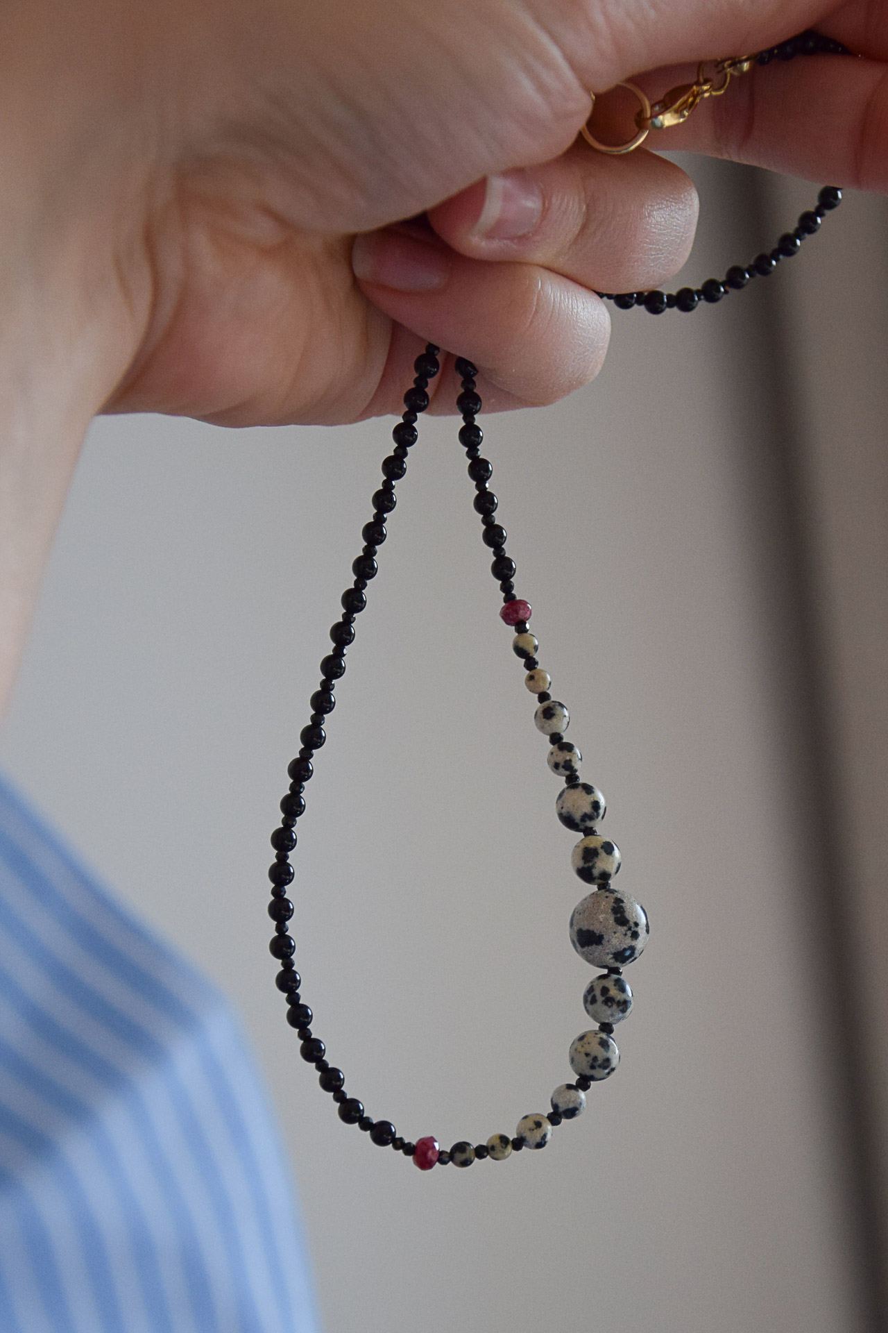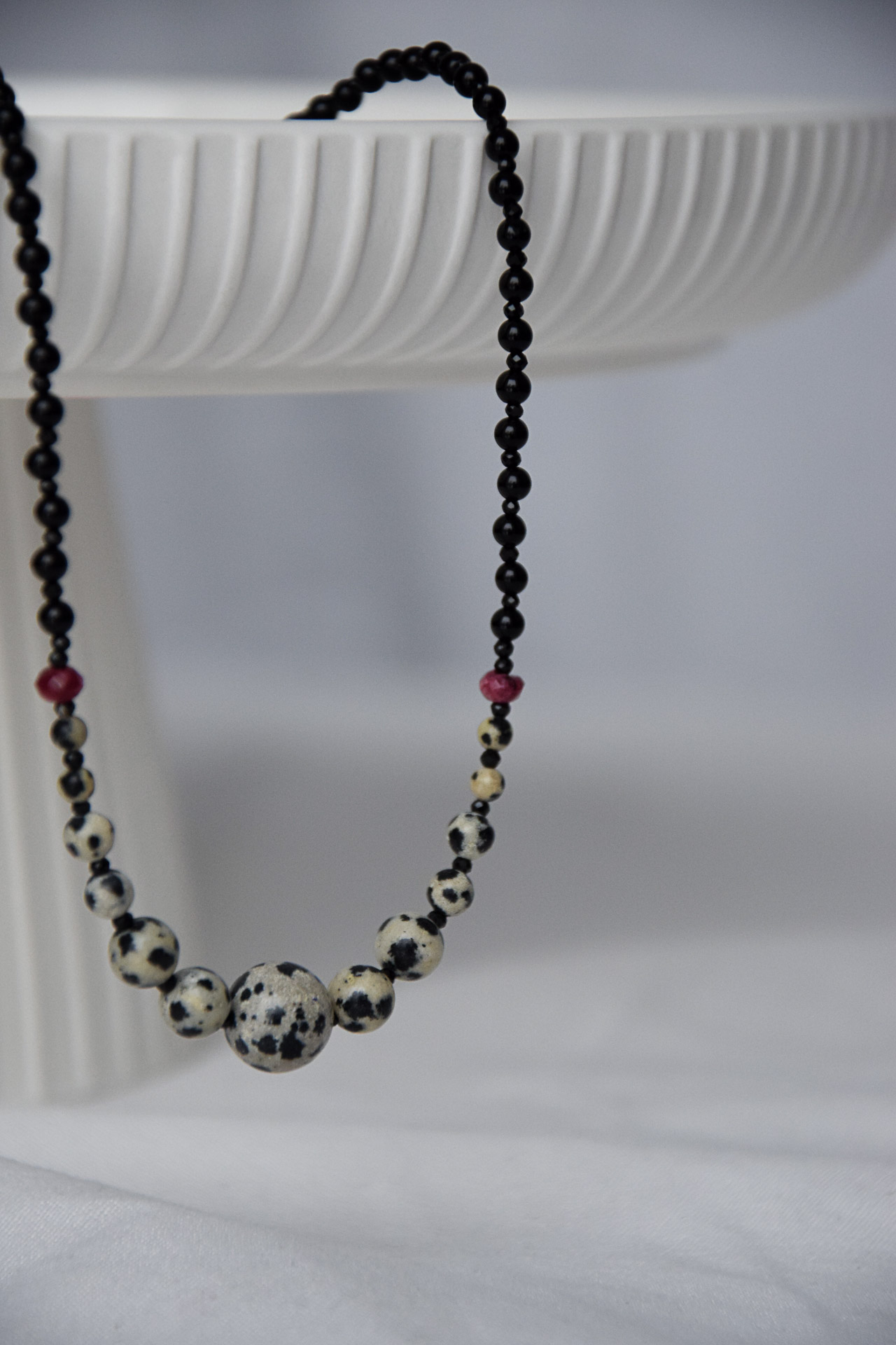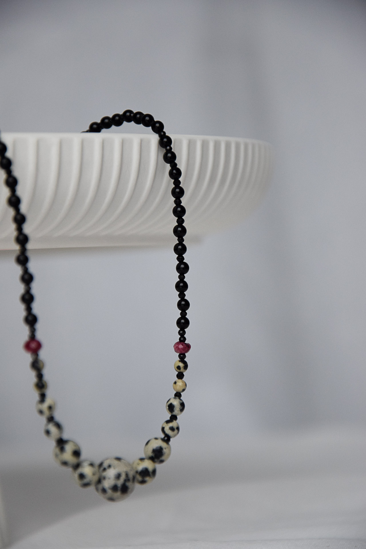 Minimalizm z nutą kontrastu. Delikatne czarne kamienie i kulki z jaspisu dalmatyńskiego tworzą spójną, nowoczesną całość, a bordowe kamienie granatu przełamują kompozycję subtelnym kolorem. Fasetowany czarny turmalin dodaje delikatnego błysku. To naszyjnik, który pasuje zarówno do codziennych stylizacji, jak i do bardziej eleganckich zestawów.