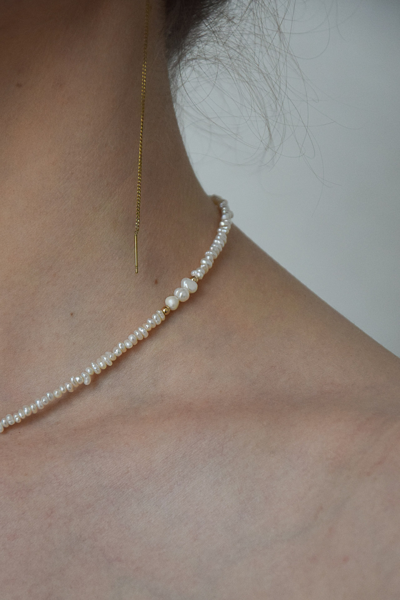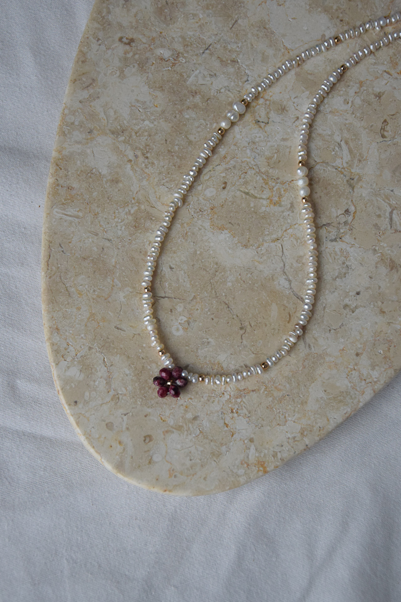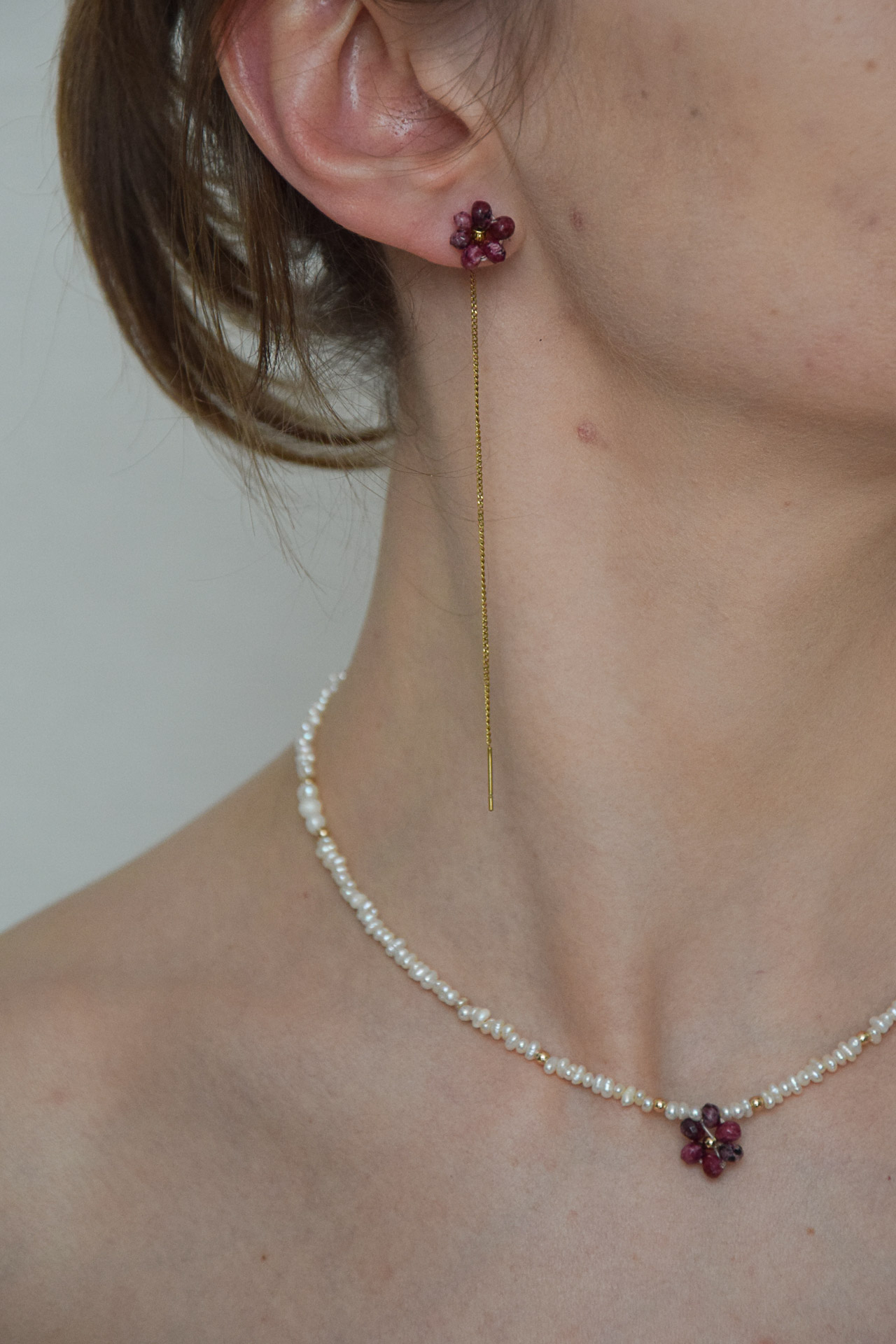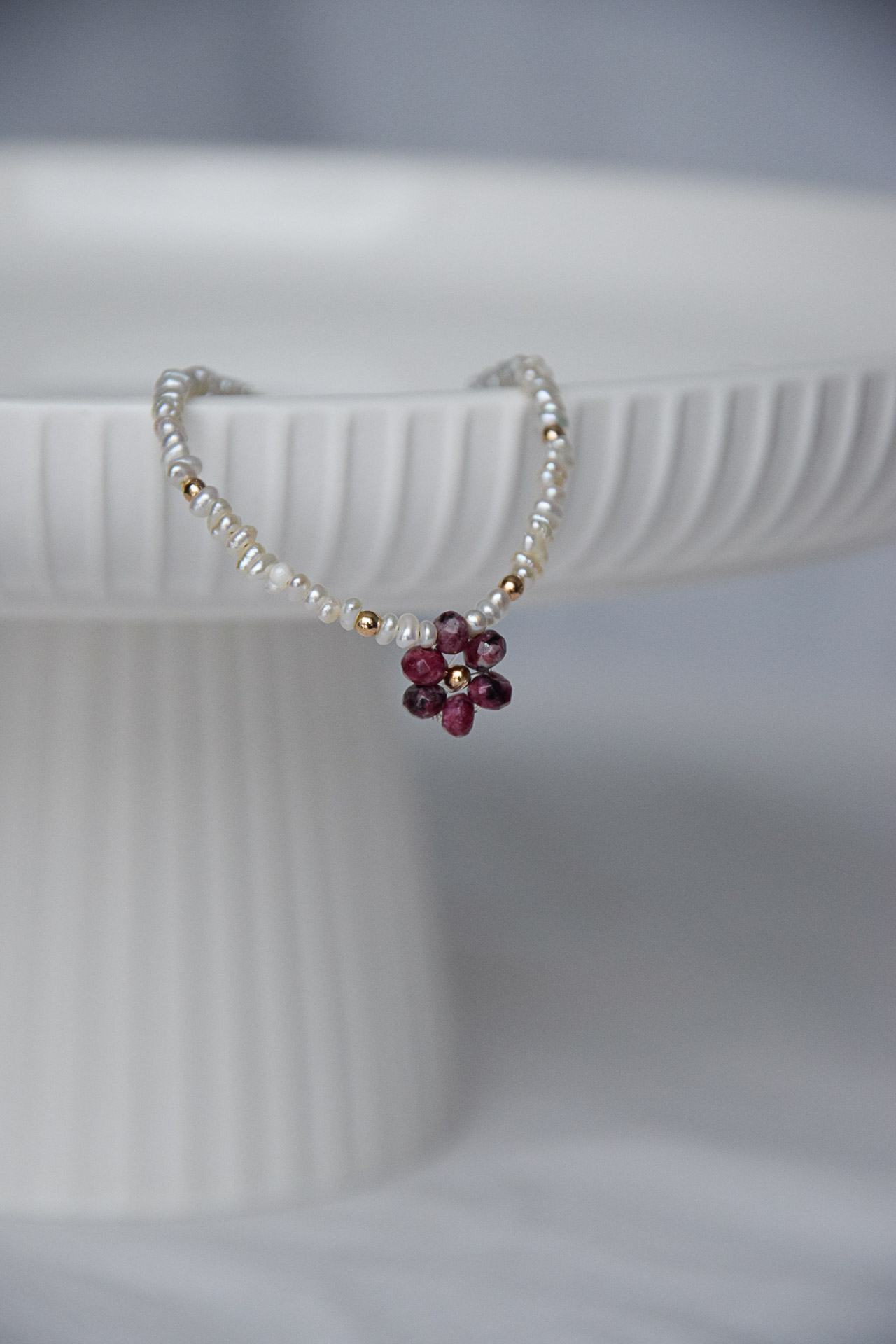 Delikatny, romantyczny akcent w minimalistycznej formie. Drobne perły tworzą subtelną bazę, a kwiaty z kamieni naturalnych dodają całości wyjątkowego uroku. Ten naszyjnik pięknie podkreśla szyję i sprawia, że stylizacja wygląda świeżo i kobieco.