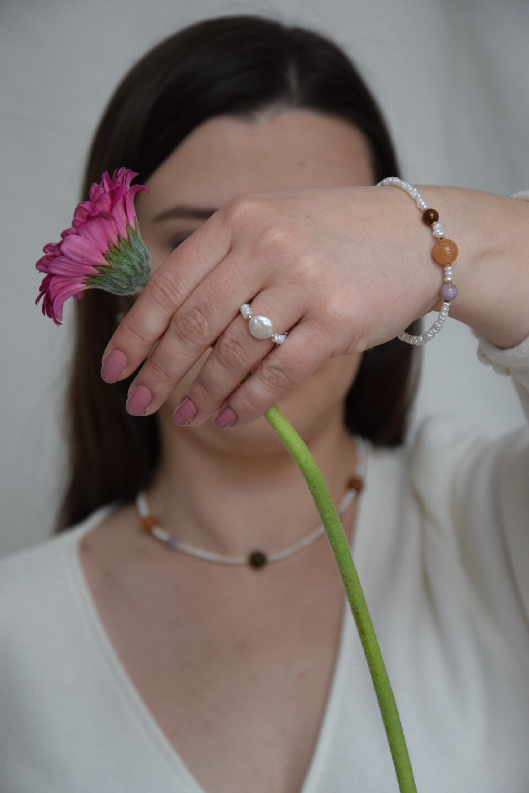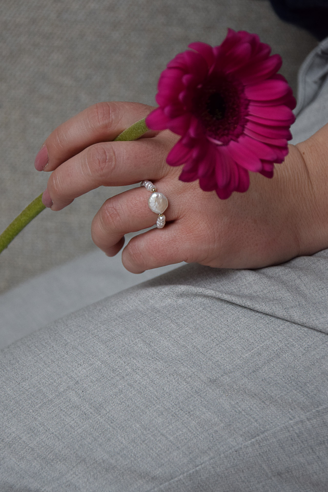 Perłowa propozycja pierścionka, który oprócz delikatnych akcentów złota wykonany jest z pereł. Główny akcent tworzy duża perła w kształcie monety.